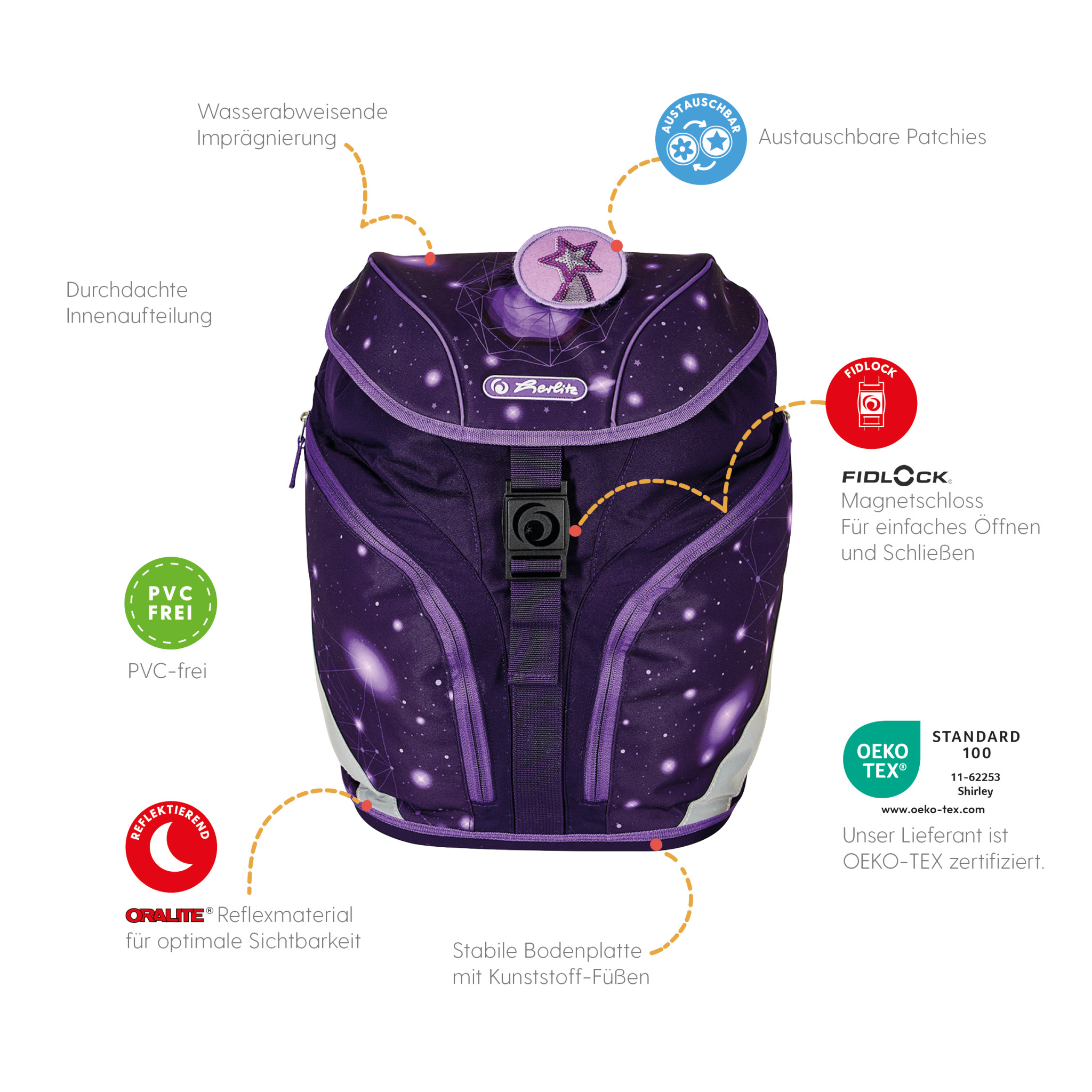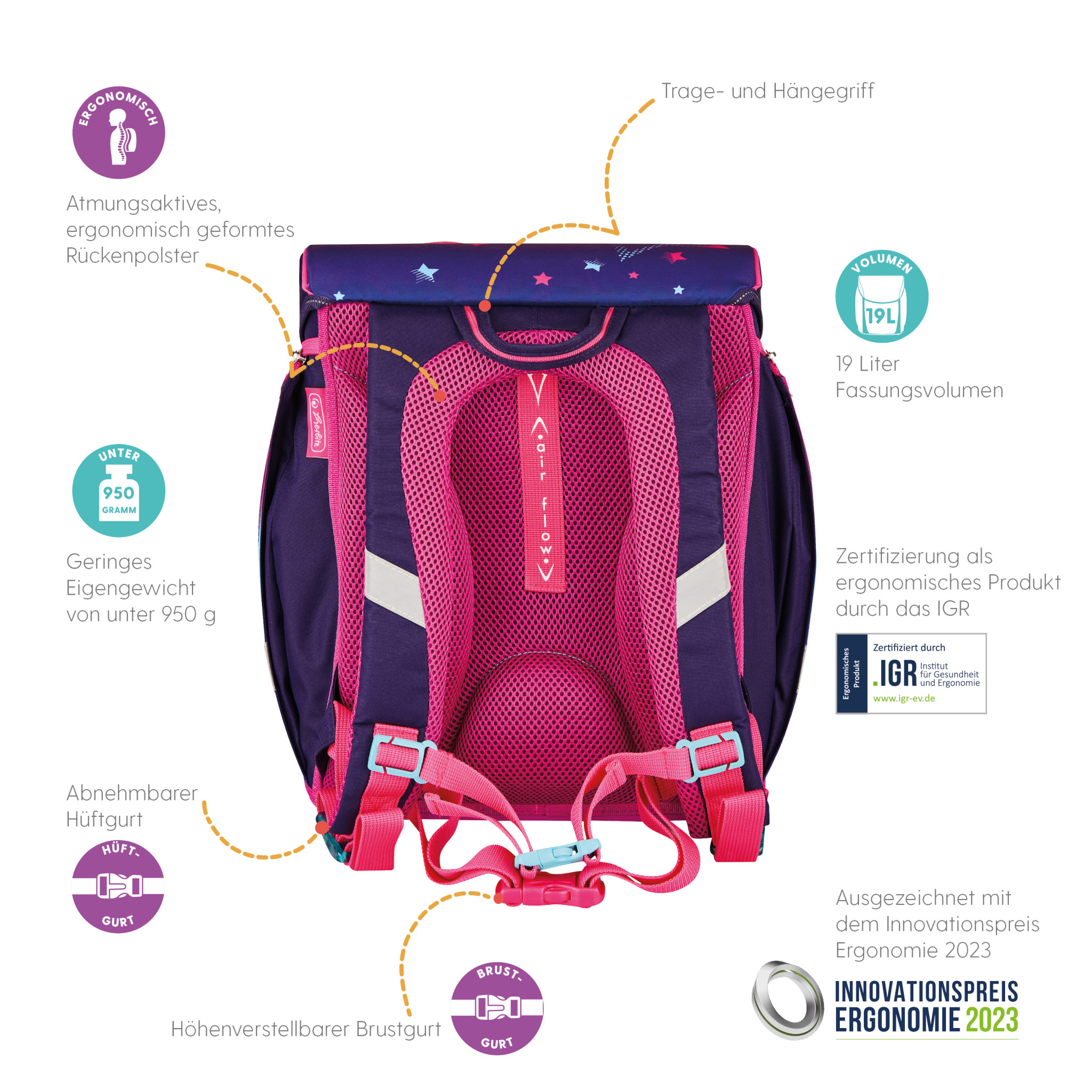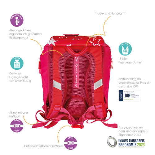 Primary school backpack SoftLight Stars & Stripes backside, with Key Facts DE |