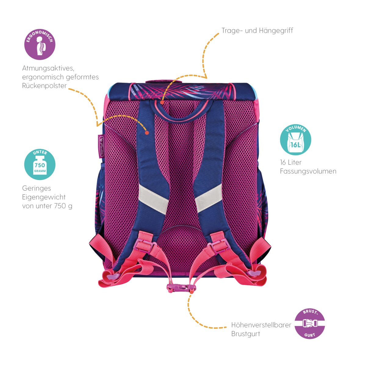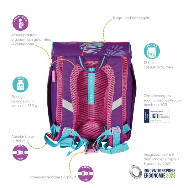 Schoolbag UltraLight Tropical Chill backside, with Key Facts DE |