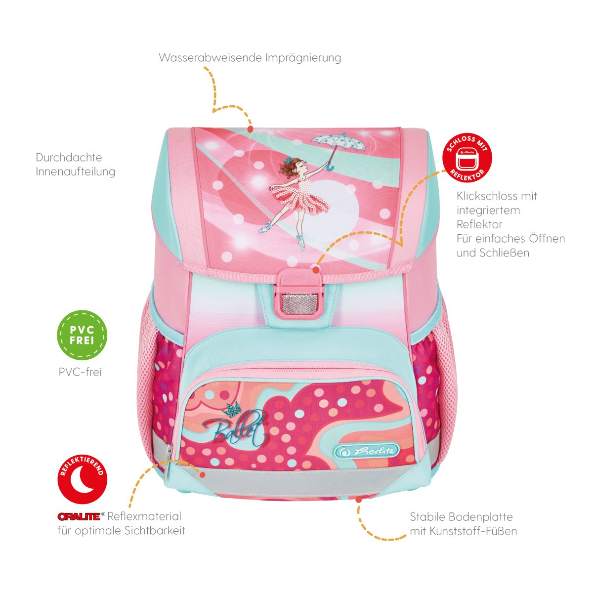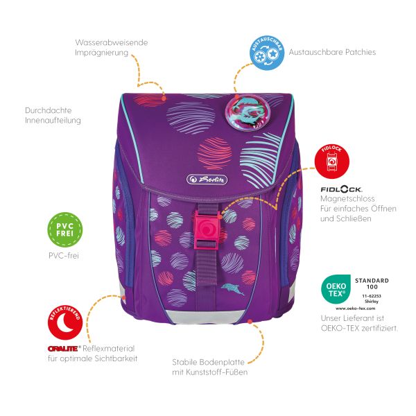 Primary school backpack SoftLight GREENline Pink Bubbles front, with Key Facts DE |