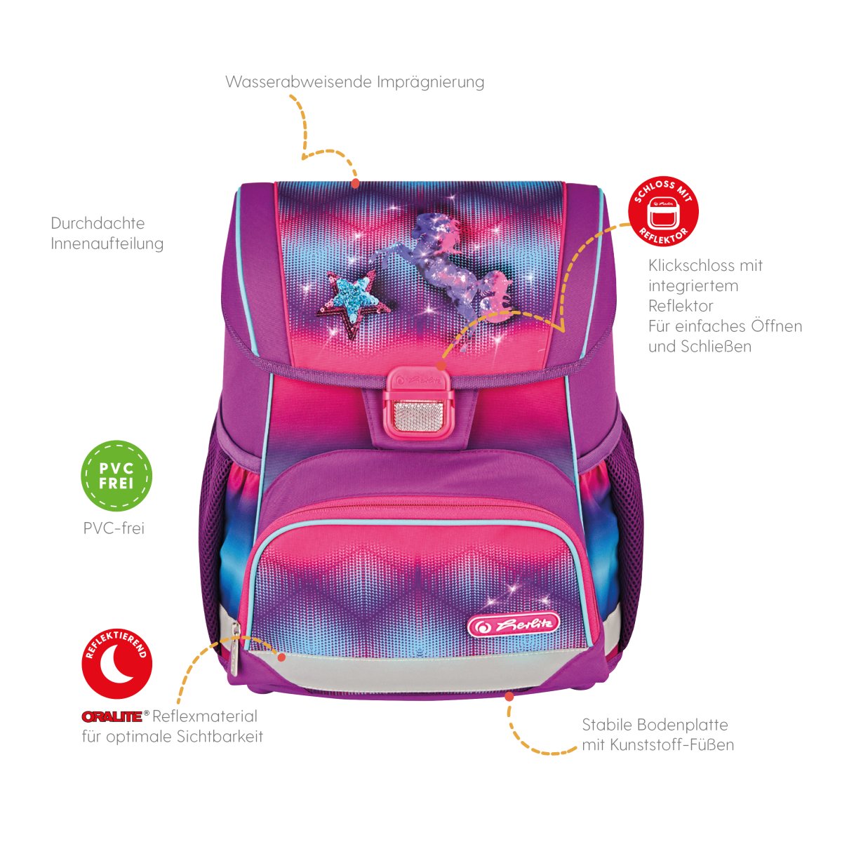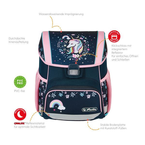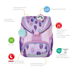 Schoolbag UltraLight Rainbow Feathers front, with Key Facts DE |