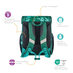 Primary school backpack SoftLight Jungle backside, with Key Facts DE |