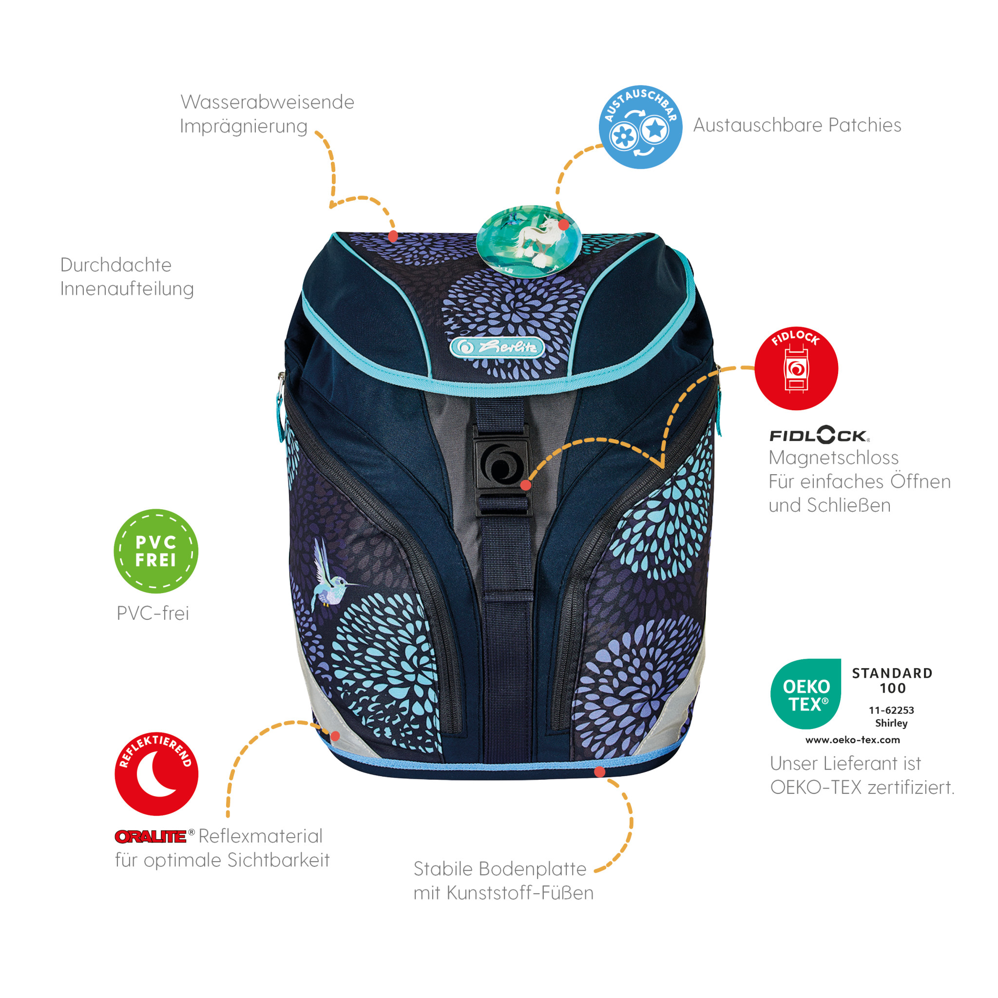 Primary school backpack SoftLight Bloomy Birds front, with Key Facts DE |
