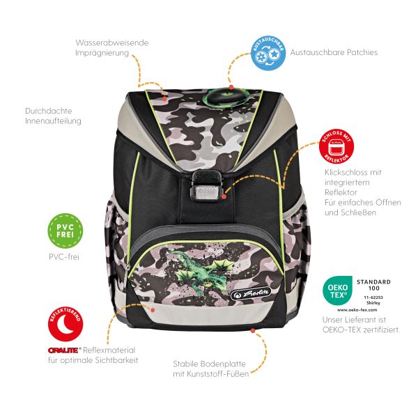 Schoolbag UltraLight Camo Dragon front, with Key Facts DE |