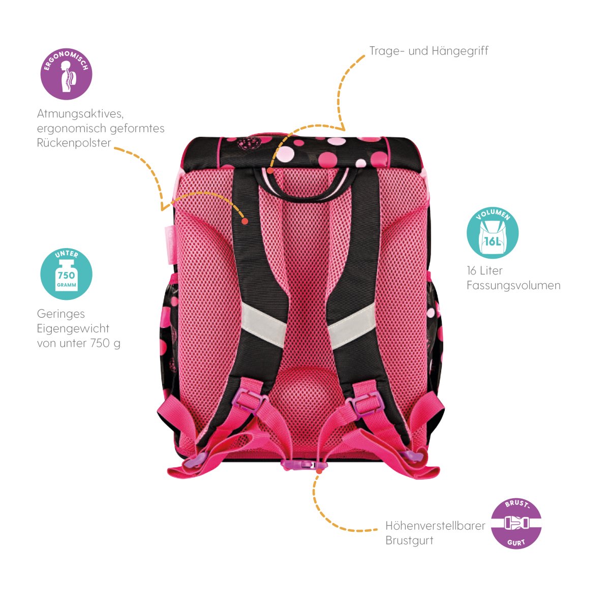 Schoolbag UltraLight Cats & Dots backside, with Key Facts DE |