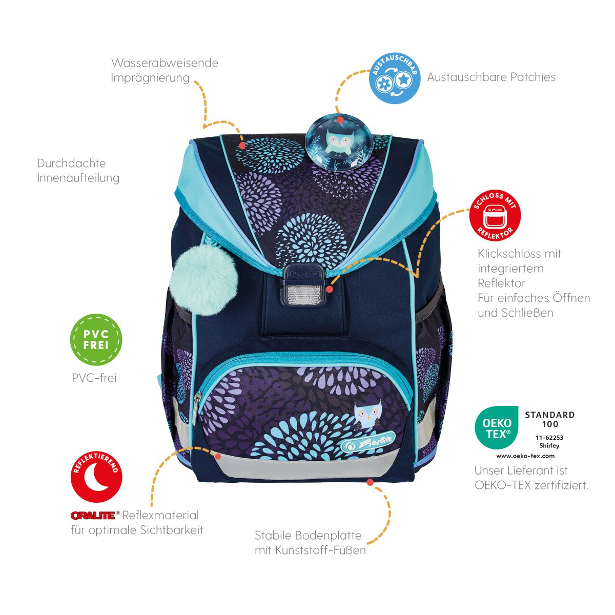 Schoolbag UltraLight Flower Owl front, with Key Facts DE |