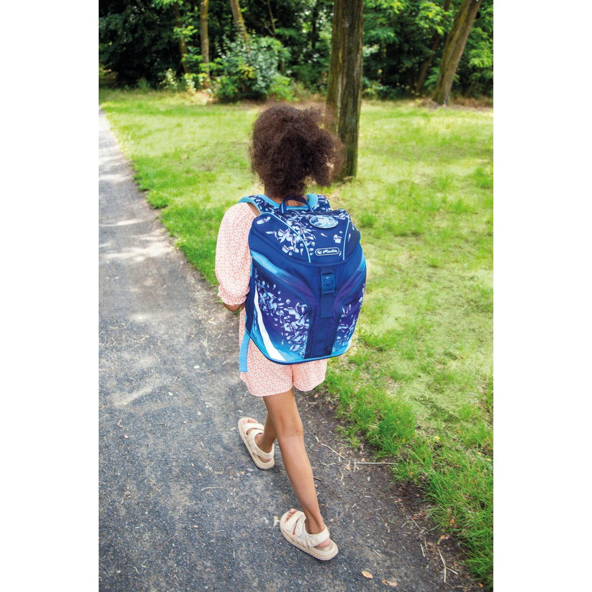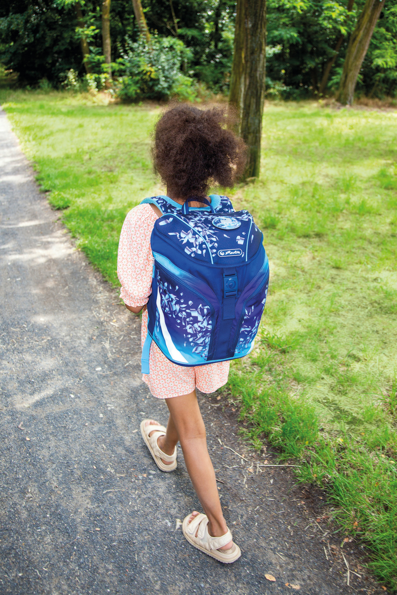 Girl with Primary school backpack SoftLight GREENline Blue Ice, walking |