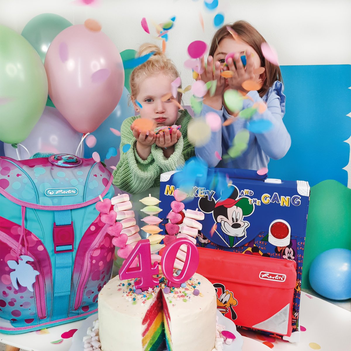 Grundschulrucksack und Schulranzen, Kuchen "40", 2 Mädchen mit Konfetti |