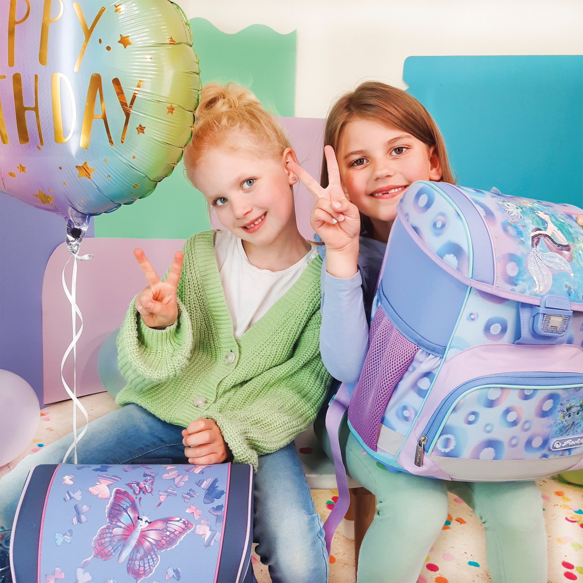 Schoolbag Loop Butterfly & Mystic Mermaid, 2 girls with Happy Birthday Ballon |