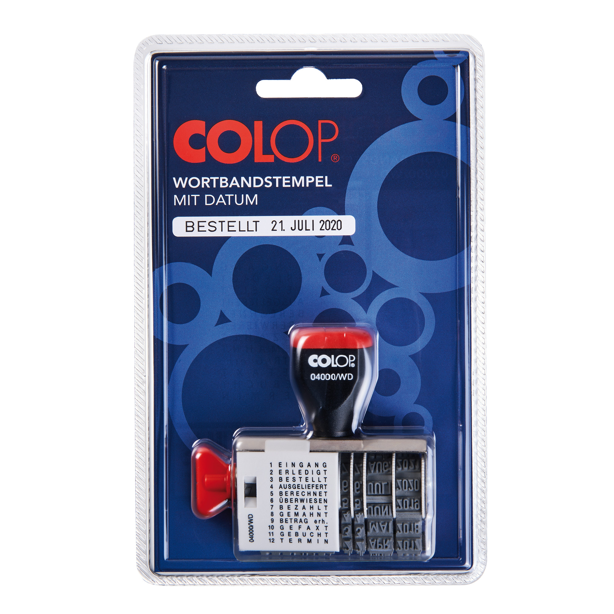 plastic date stamp valid for 11 years with 12 different office texts in German letters, day, month (German) grey/black 1 piece on double foil-blister card |