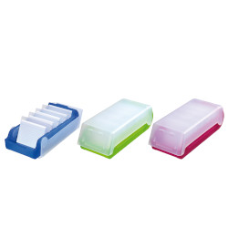 USP | Box für Karteikarten A8; Bis zu 600 karteikarten; 5-Fächer-System; Mit 4 Trennwänden; Aus Kunststoff; Farbe: transzulent, farbig sortiert; Inkl. 100 Karteikarten |