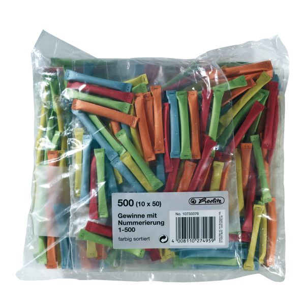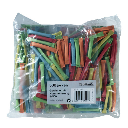 | paper numbered 1-500 stapled 10 x 50 pieces in pouch assorted colours 500 pieces (10 pouches), shrink-wrapped |