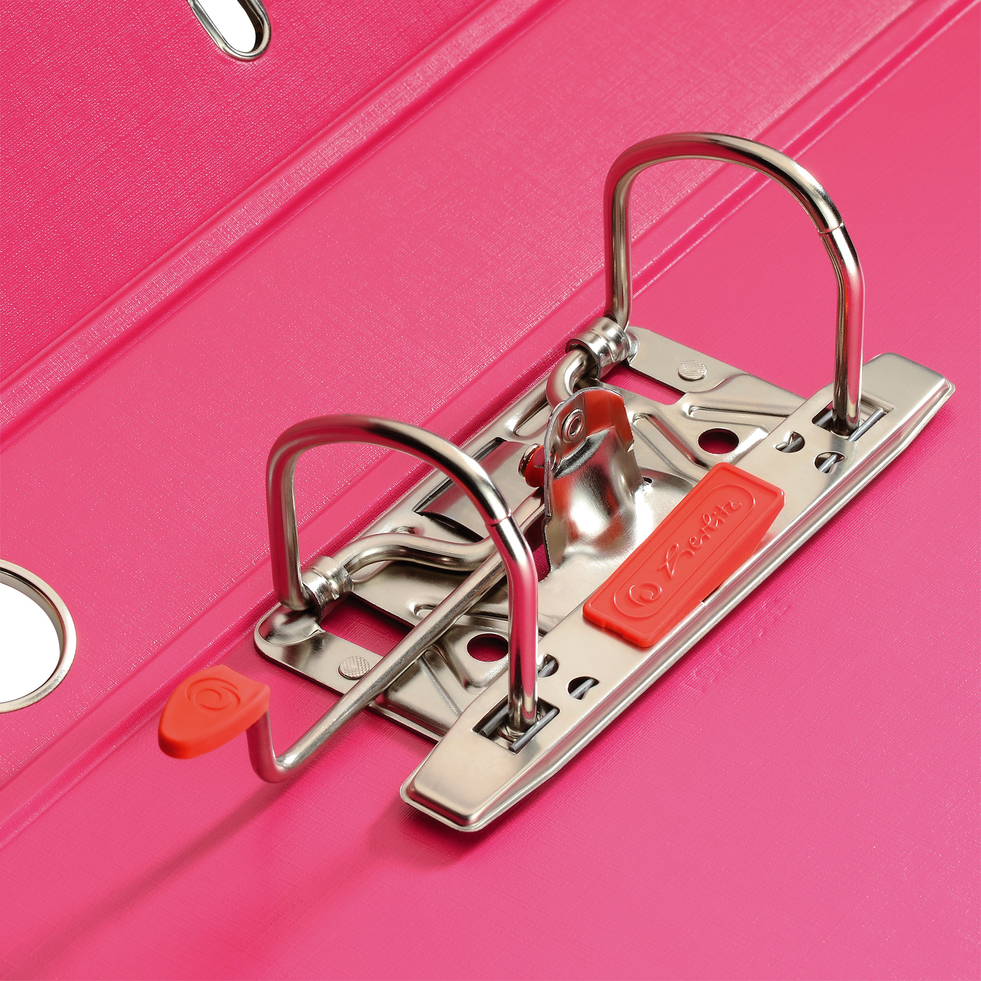 | PP laminated cover,inside & outside protective metal rims, stable reversible spine label logo-embossing below finger hole FSC Mix fuchsia 1 piece |