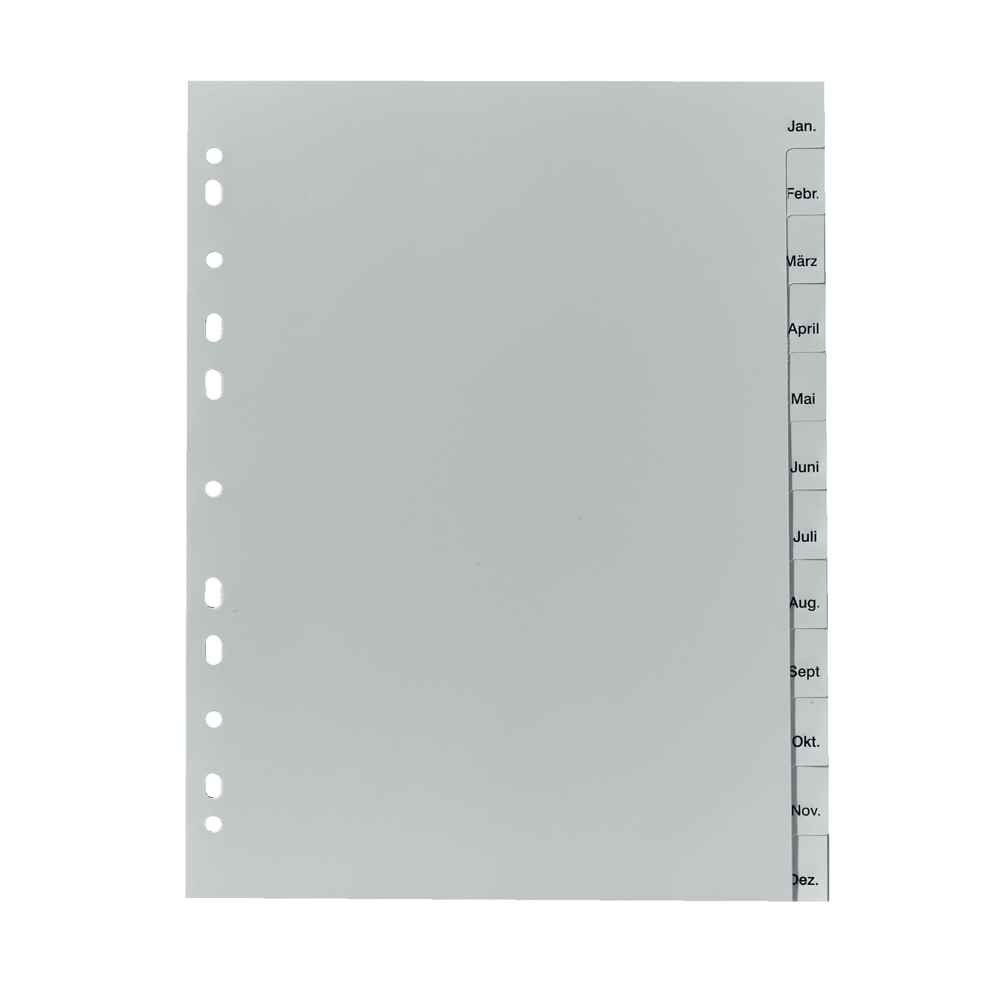 | USP | Register A4 Januar-Dezember zur Ablage von Dokumenten pro Monat; 12 teilig; Eurolochung zum Abheften; Graue PP-Folie; zusätzliches Deckblatt aus Papier zur Nutzung als Inhaltsverzeichnis |