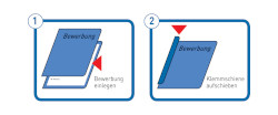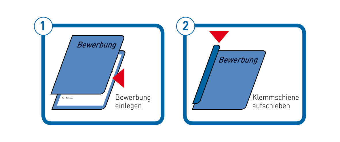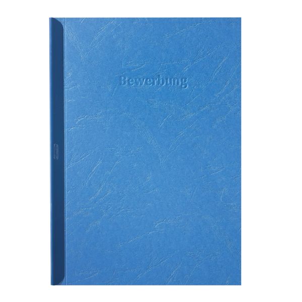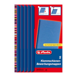 | recycling-cardboard, leather embossed with 5 blue rail binder clips, 5 front covers, 5 back covers front cov.with blind emb."Bewerbung" capacity approx. 30 sheets blue 5 piece, shrink wrapped |