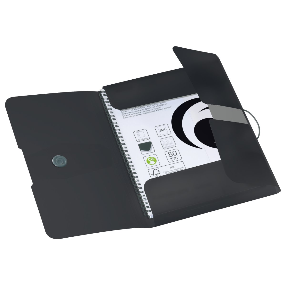 | PP-foil with design-print 3 flaps elastic cord, round with whirl button opaque black 1 piece |