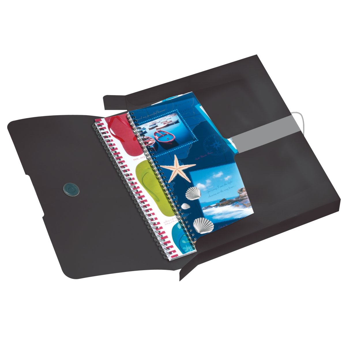 PP-foil with design-print spine width 4cm, elastic cord,round with whirl button self adhesive spine label opaque black 1 piece |
