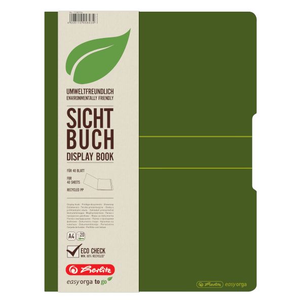 USP | Sichtbuch A4; Aus Recycling PP; Mit 20 Klarsichthüllen; Klarsichthüllen dokumentenecht; Mit aufgeklebtem Rückenschild; Weichmacherfrei; Farbe: Dunkelgrün |