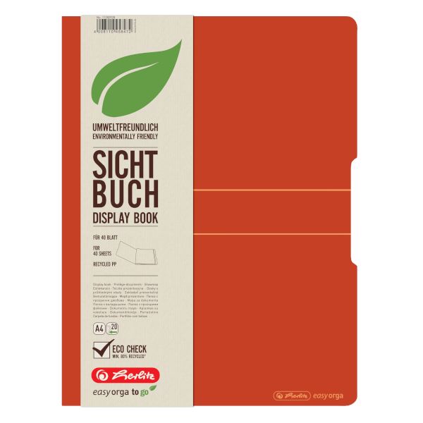 USP | Sichtbuch A4; Aus Recycling PP; Mit 20 Klarsichthüllen; Klarsichthüllen dokumentenecht; Mit aufgeklebtem Rückenschild; Weichmacherfrei; Farbe: Orange |