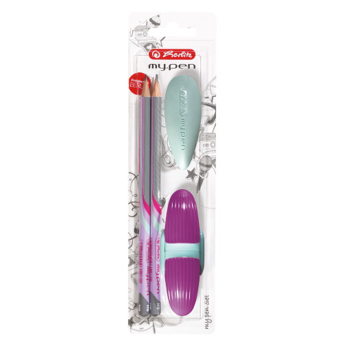 2 my.pen pencils HB 1 my.pen eraser 1 my.pen double sharpener assorted colours set on blister card |