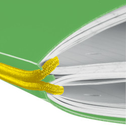 | woodfree paper, 80gsm white 2x40 sheets, ruled no.27 and squared 28 punched, microperforation PP cover, light green rounded edges elastic for closure yellow 1 piece |