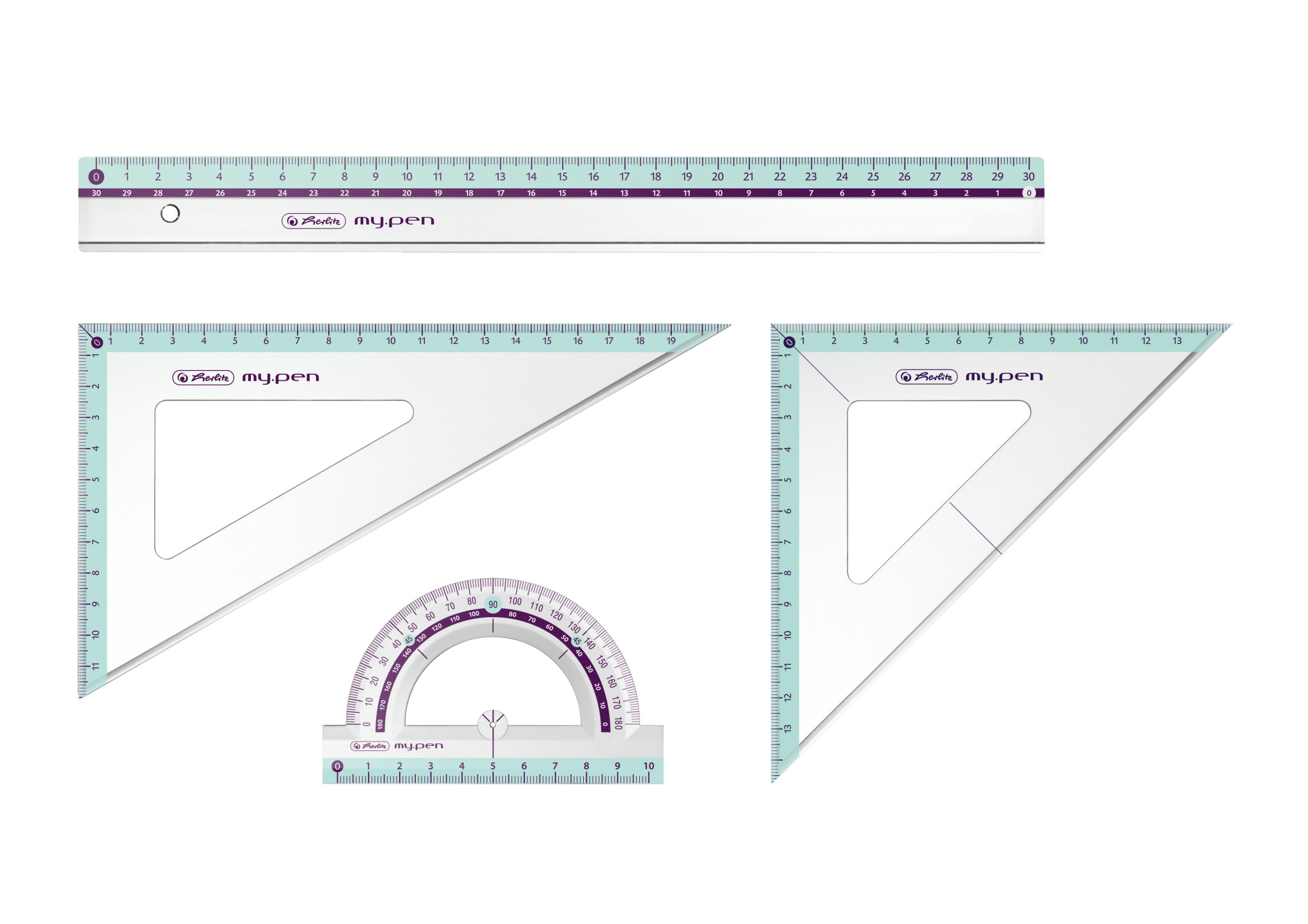 | USP | Herlitz my.pen Geometrieset; Inhalt: 1 Lineal 30cm, 1 Winkelmesser 10cm, 2 Geometriedreiecke; Bruchsicheres Material; Kunststoff; Farbig sortiert; Keine Farbauswahl möglich |
