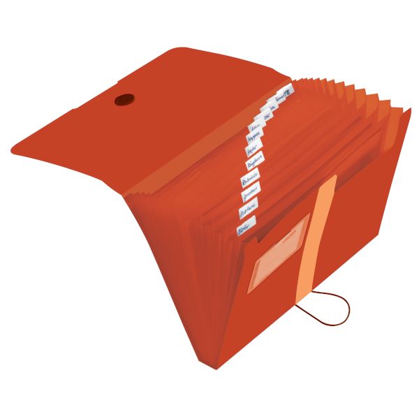 | recycling-PP-foil w.design-print,w.12 expand.compart- ments,writeable tabs f.index,with a pocket f.busi.card, el.cord,round w.whirl button orange 1 piece |