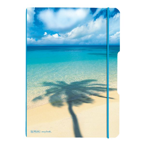| woodfree paper, 80gsm white 2x40 sheets, ruled no.27 and squared 28 punched, microperforation PP exchangeable cover, motif Palm Tree rounded edges elastic for closure turquoise 1 piece |
