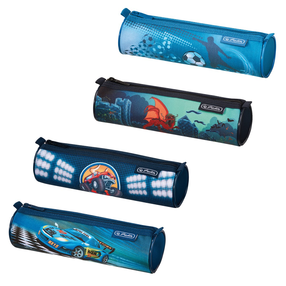 | polyester 21,5 x 6 x 6 cm round, 1 pocket with zipper super racer, monster truck, soccer, dragon 4 designs assorted |