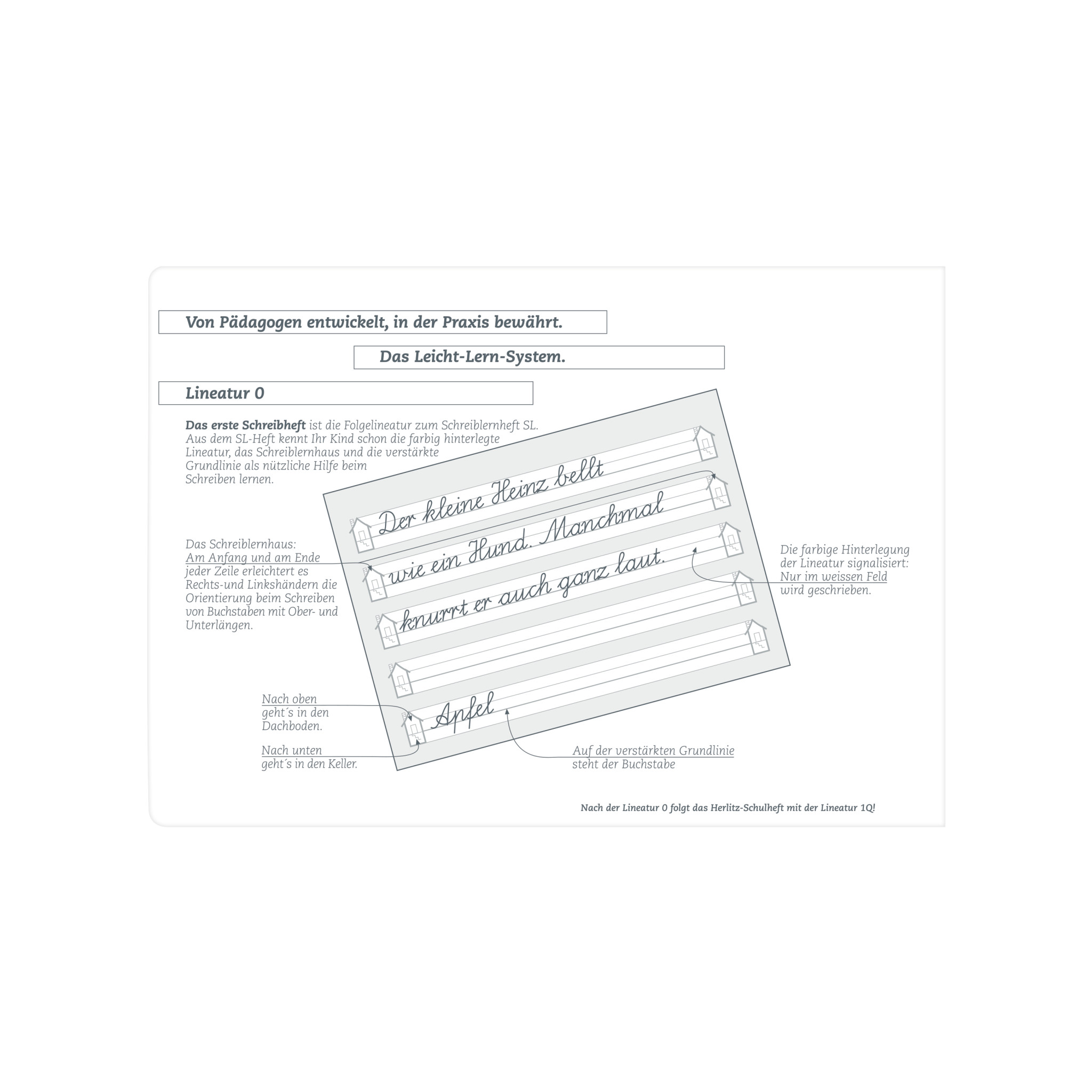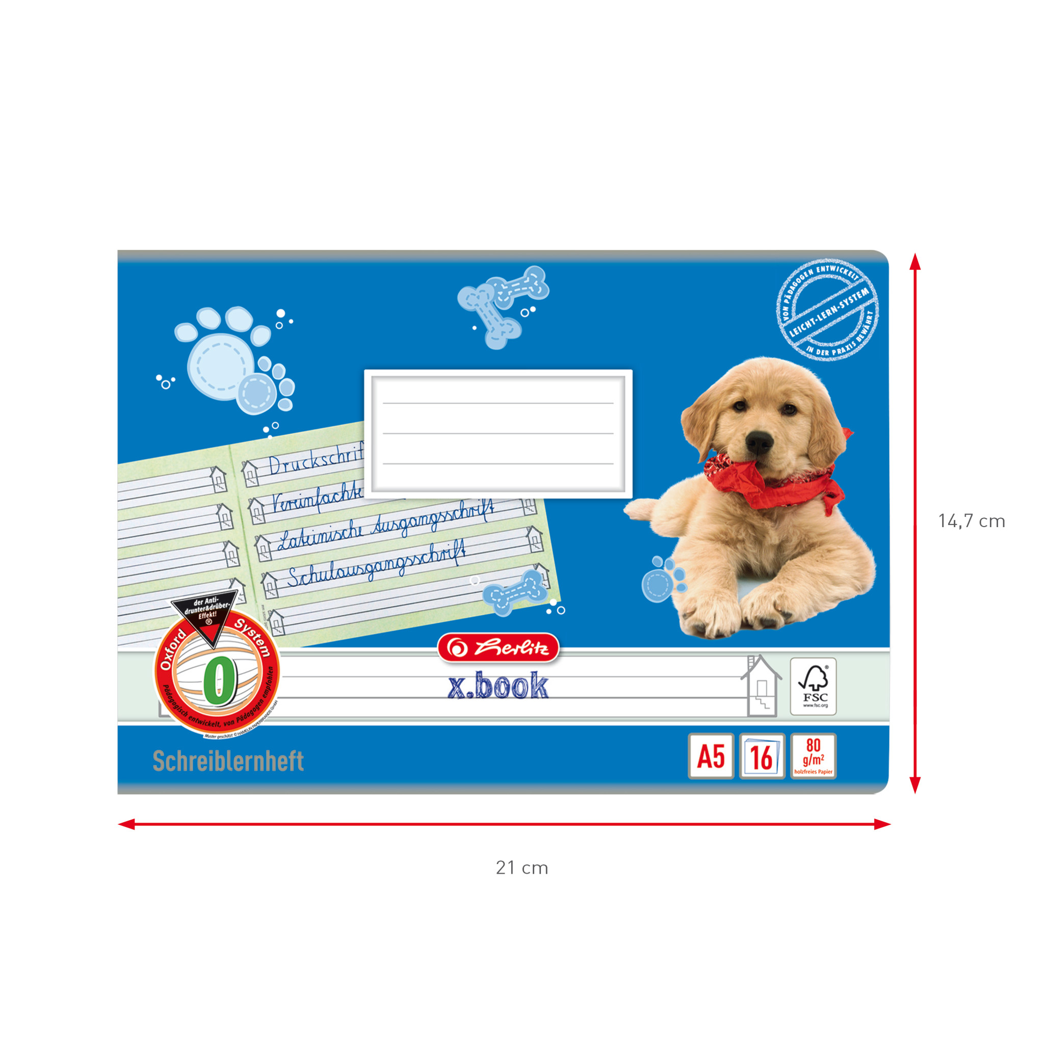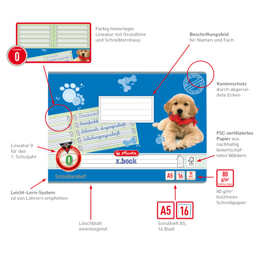 | USP | Schulheft A5 Lineatur 0 für 1. Schuljahr; farbig hinterlegte Lineatur mit verstärkter Grundlinie und Schreiblernhaus von Pädagogen entwickelt und empfohlen; mit Anleitung zur Nutzung des Leicht-Lern-Systems; Schutz durch abgerundete Ecken; 16 Blatt holzfreies 80g/m² Schreibpapier; FSC zertifiziert Beschriftungsfeld auf der Vorderseite; Deckblattgestaltung Motiv Hund; |