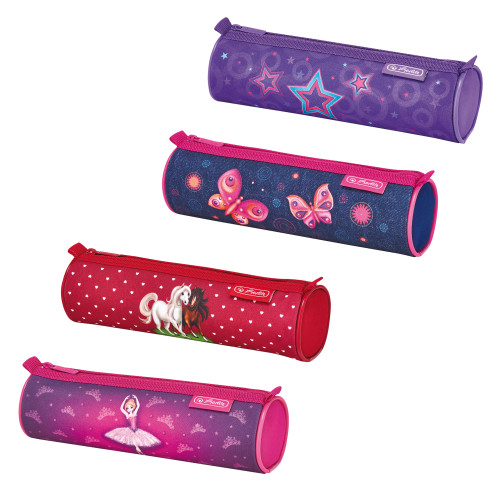 | polyester 21,5 x 6 x 6 cm round, 1 pocket with zipper Ballerina, Horses, Butterfly Dreams, Stars 4 designs assorted |