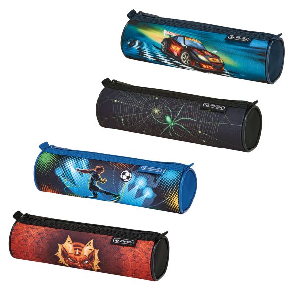 | polyester 21,5 x 6 x 6 cm round, 1 pocket with zipper Dragon, Soccer, Spider, Super Racer 4 designs assorted |