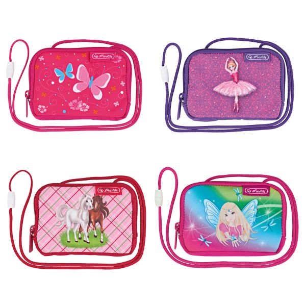 | polyester 14,5 x 10,5 x 2 cm with cord, safety clip zipper pocket, sight pocket Butterfly, Ballerina, Horses, Fairy 4 designs assorted |
