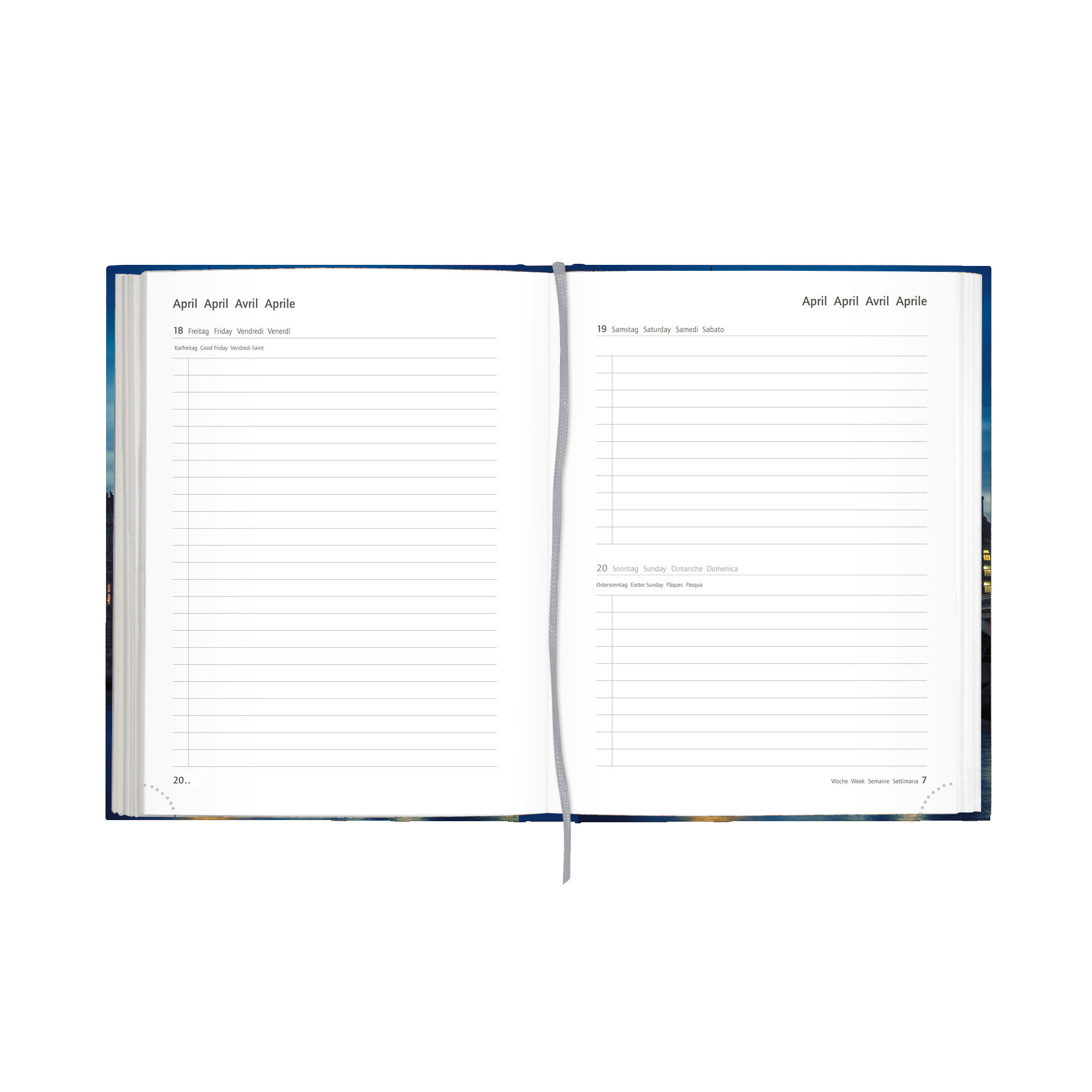 padded cover, glossy foil lamination 352 pages, paper 70gsm, FSC Mix 1 day=1 p., Sa/Su=1 p., Aug. 18-July 19 4 languages: D,GB,F,I holidays D,A,CH,F timetable, results, bookmark, corner perf. motif Powder, pages 1c printing 1 piece |