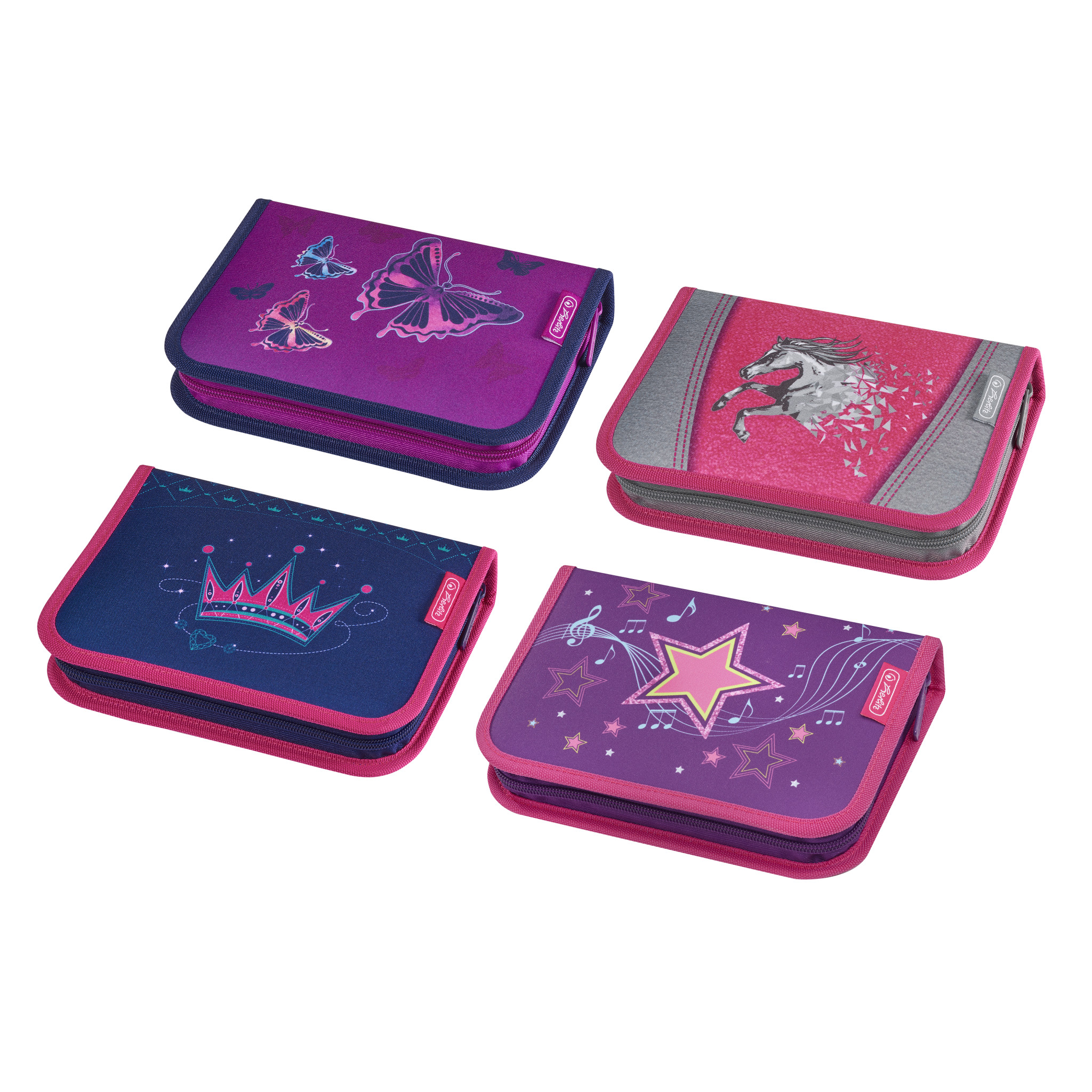 | polyester 19,3 x 13,5 x 3,5 cm empty, 1 flap, coloured inner lining Glitter Butterfly, Power Horse, Crown, Melody Star 4 designs assorted |