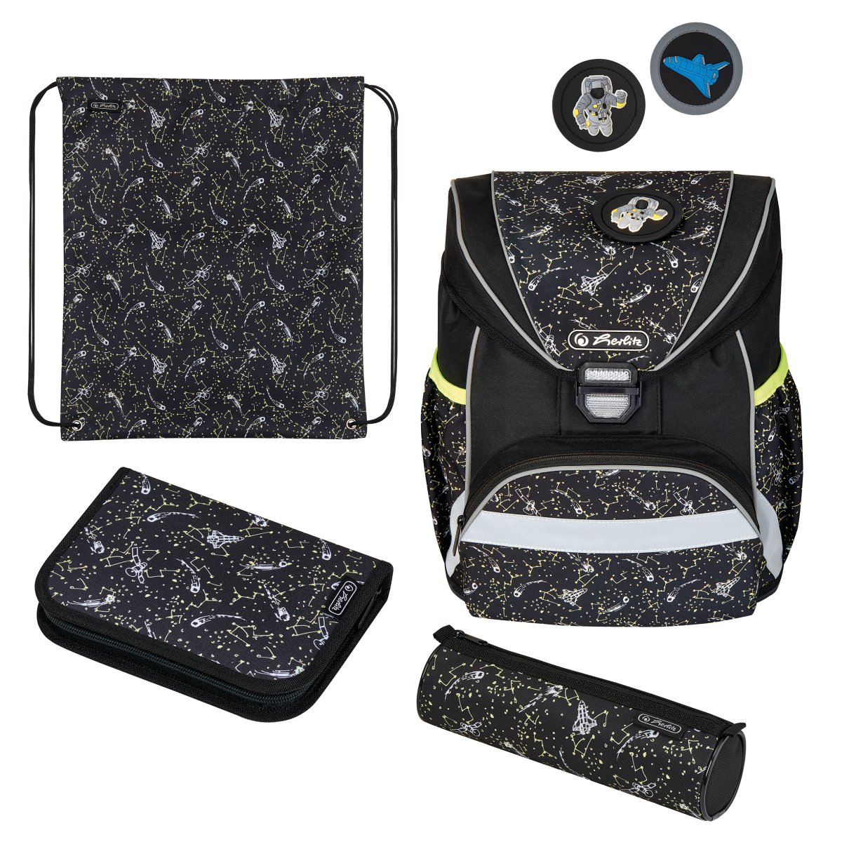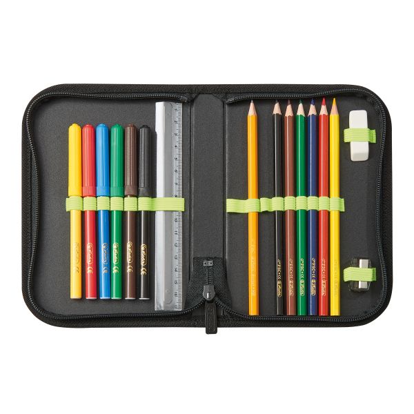 polyester 36 x 28 x 21 cm soft body, click lock with reflector ergon. backpadding, chest strap adjustable shoulder straps stable bottom plate Orafol mat., light weight approx. 750g 2 removable applications with velcro pencil case 16pcs. from FSC certified pencils pencil pouch round and sports sac |