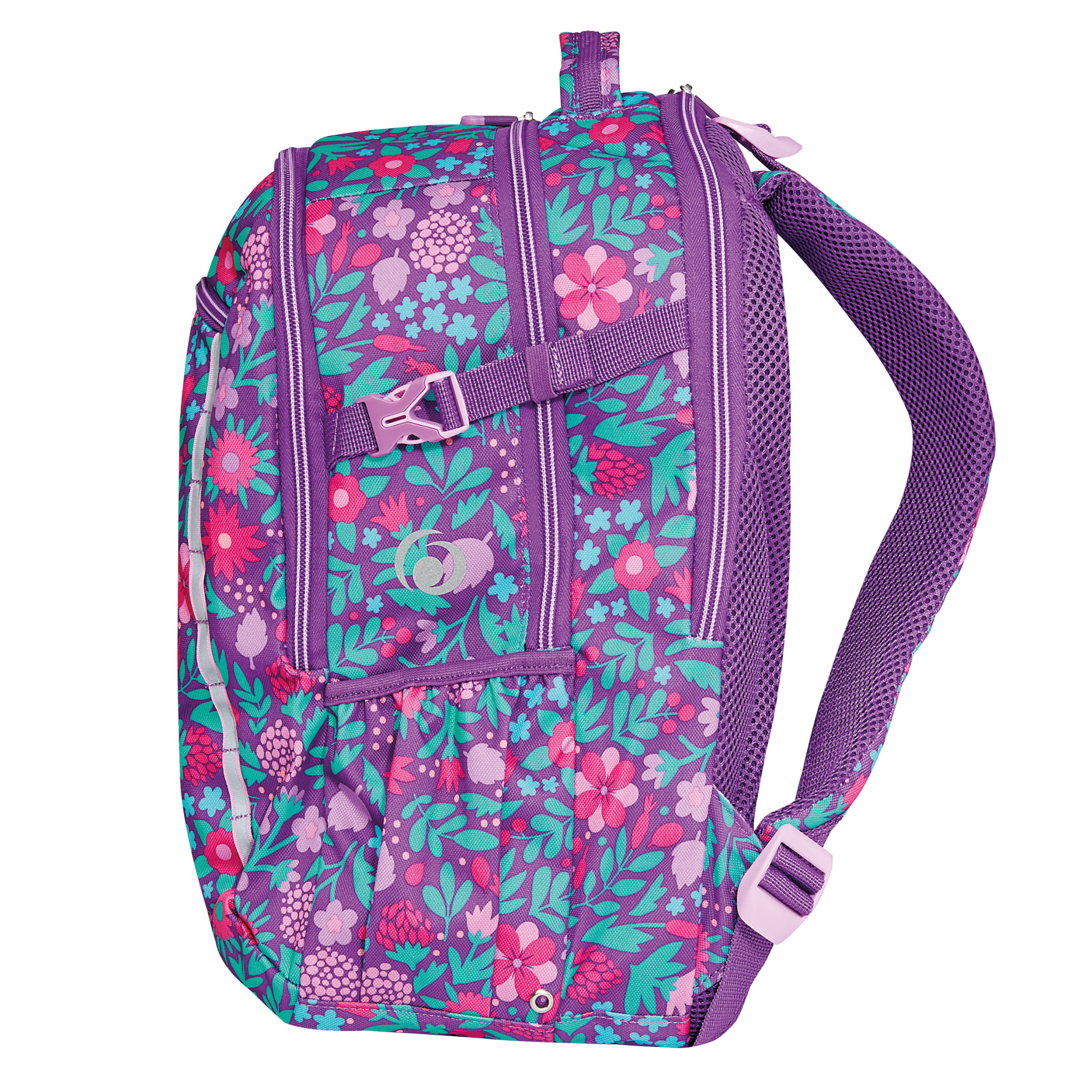 | polyester 70% recycled outer material 41 x 31 x 22 cm ergonom. back padding, hip strap dual adjustable shoulder straps 3 main pockets, 1 front pocket side pockets with elastic reflective material, plastic feet compression straps light weight approx. 650g empty |