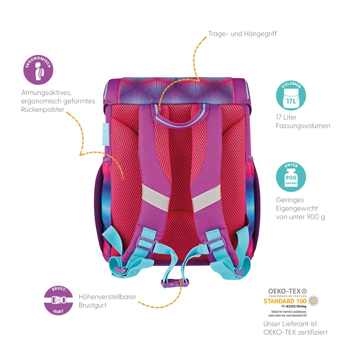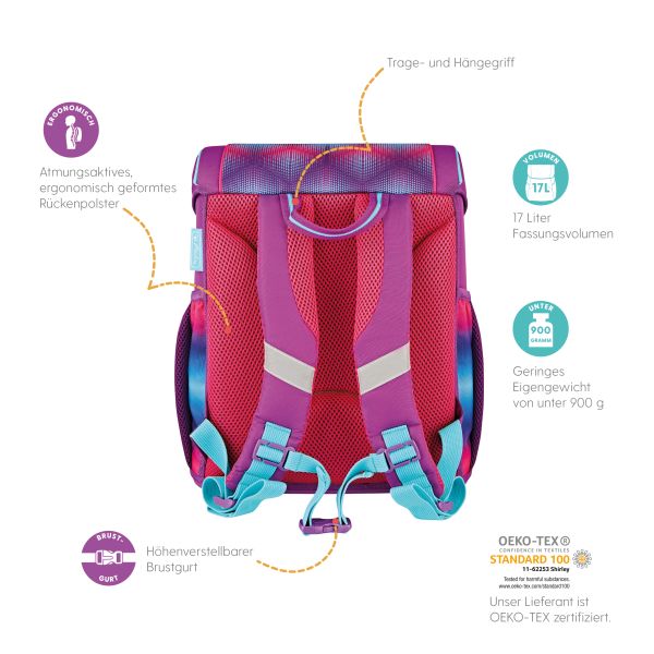 USP | Eigengewicht unter 900g; ergonomisch geformte Rückenpolster; verstellbare Schultergurte; höhenverstellbarer Brustgurt; angenehme Passform; Orafol Reflexmaterialien; Klickschloss mit Reflektor; geräumiges Innenfach mit separatem Bücherfach; 1 Fronttasche; 2 Seitentaschen mit Gummizug; stabile Bodenplatte; Befüllteile: Sportbeutel; Schüleretui unbefüllt mit 2 Klappen, Faulenzer oval; Maße: 37x31x22cm; Gewicht: unter 1kg; Volumen: ca. 17l; Material: Polyester |