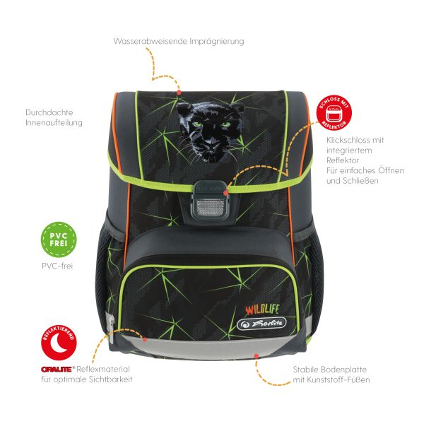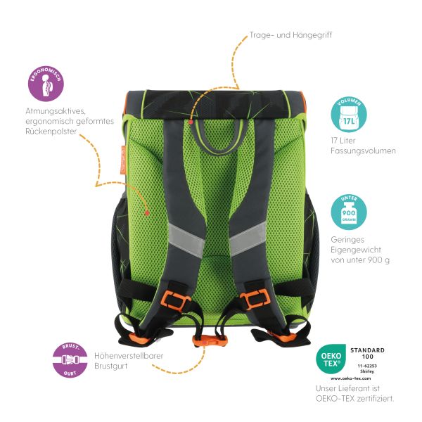 USP | Eigengewicht unter 900g; ergonomisch geformte Rückenpolster; verstellbare Schultergurte; höhenverstellbarer Brustgurt; angenehme Passform; Orafol Reflexmaterialien; Klickschloss mit Reflektor; geräumiges Innenfach mit separatem Bücherfach; 1 Fronttasche; 2 Seitentaschen mit Gummizug; stabile Bodenplatte; unbefüllt; Maße: 37x31x22cm; Gewicht: unter 900g; Volumen: ca. 17l; Material: Polyester |