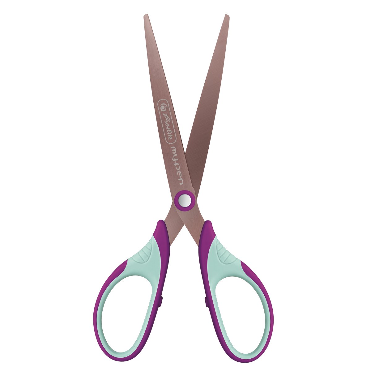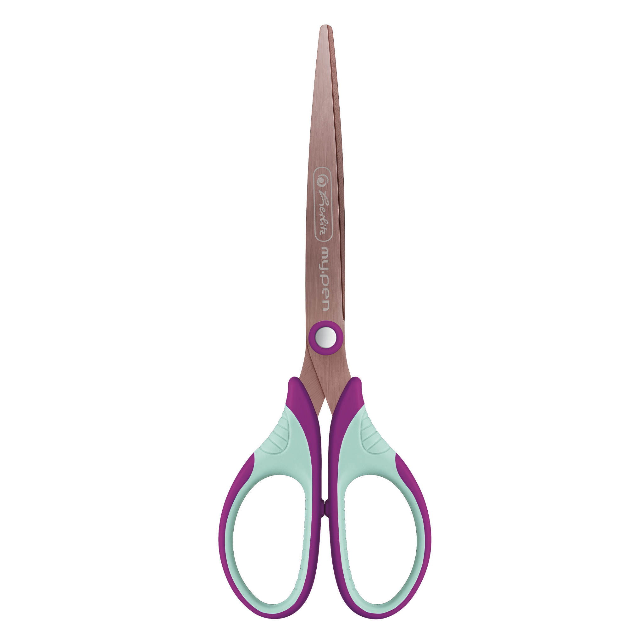 USP | Schere my.pen; Ergonomischer Griffbereich durch Materialmix; Material Stahl/Kunststoff; Farbige Scherenblätter; Farbe lila/minze |