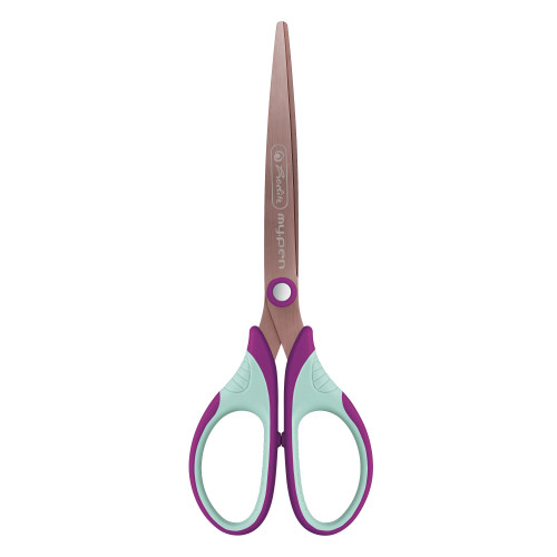 steel / plastic ergonomic finger loops due to material mix of plastics and rubber blades inspired by scissors color color purple and mint 1 piece on rivet card with titanium nitride coating |