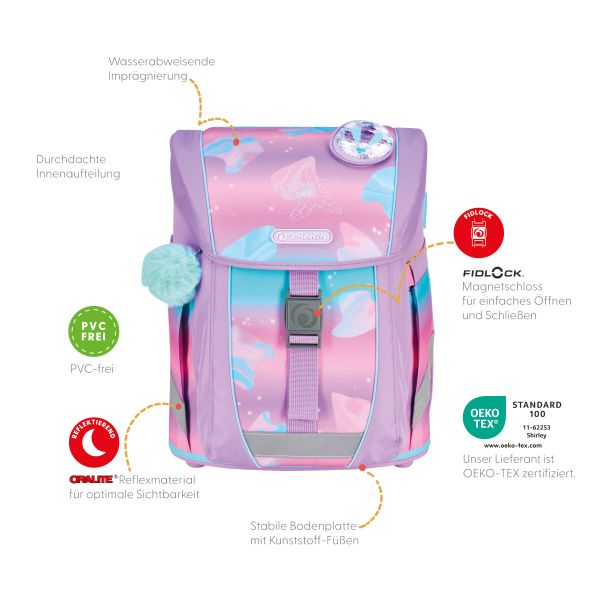 Polyester 39 x 32 x 23 cm ergoActive® System, IGR certification Magnetic lock, stable bottom plate adjust. chest strap, removable hip strap 1 removable application with Velcro 1 pompom pencil case 16pcs., sports sac, pencil pouch sport, lunchbox with FSC certified pencils |