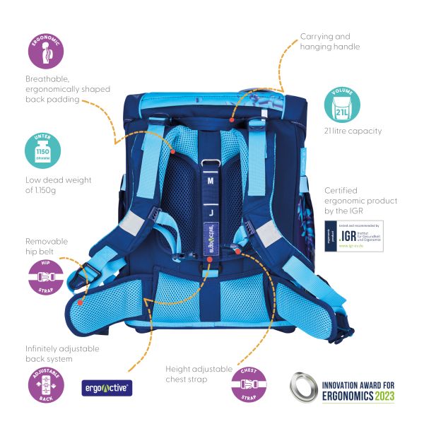 Polyester 39 x 32 x 23 cm ergoActive® System, IGR certification Magnetic lock, stable bottom plate adjust. chest strap, removable hip strap 1 removable application with Velcro 1 felt dangler turtle pencil case 16pcs., sports sac, pencil pouch sport, lunchbox with FSC certified pencils |