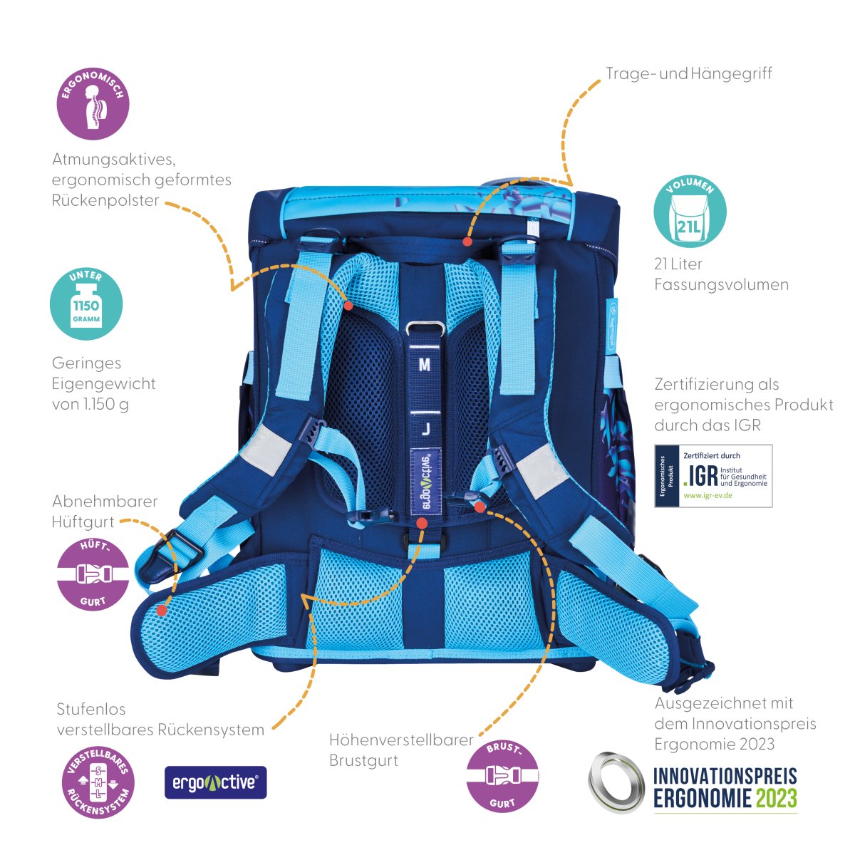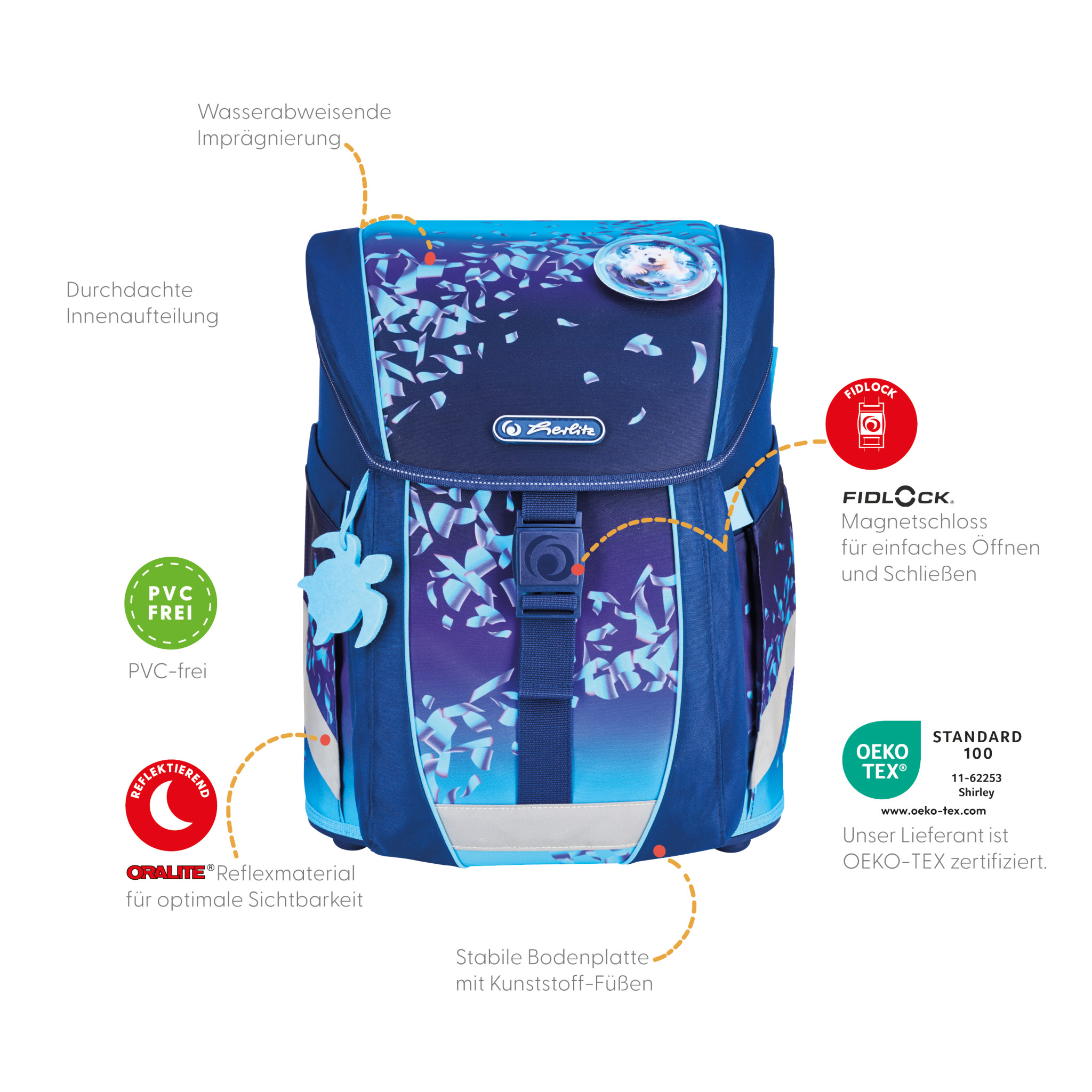 | Polyester 39 x 32 x 23 cm ergoActive® System, IGR certification Magnetic lock, stable bottom plate adjust. chest strap, removable hip strap 1 removable application with Velcro 1 felt dangler turtle pencil case 16pcs., sports sac, pencil pouch sport, lunchbox with FSC certified pencils |