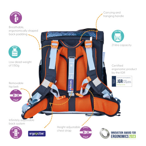 Polyester 39 x 32 x 23 cm ergoActive® System, IGR certification Magnetic lock, stable bottom plate adjust. chest strap, removable hip strap 2 removable applications with Velcro pencil case 16pcs., sports sac, pencil pouch sport, lunchbox with FSC certified pencils |