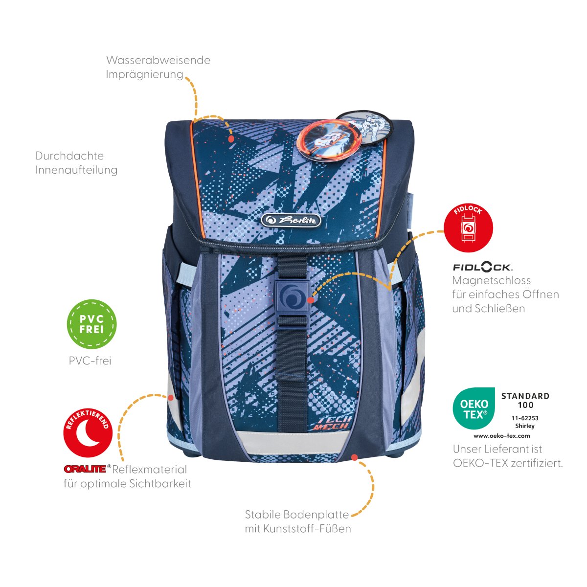 | Polyester 39 x 32 x 23 cm ergoActive® System, IGR certification Magnetic lock, stable bottom plate adjust. chest strap, removable hip strap 2 removable applications with Velcro pencil case 16pcs., sports sac, pencil pouch sport, lunchbox with FSC certified pencils |