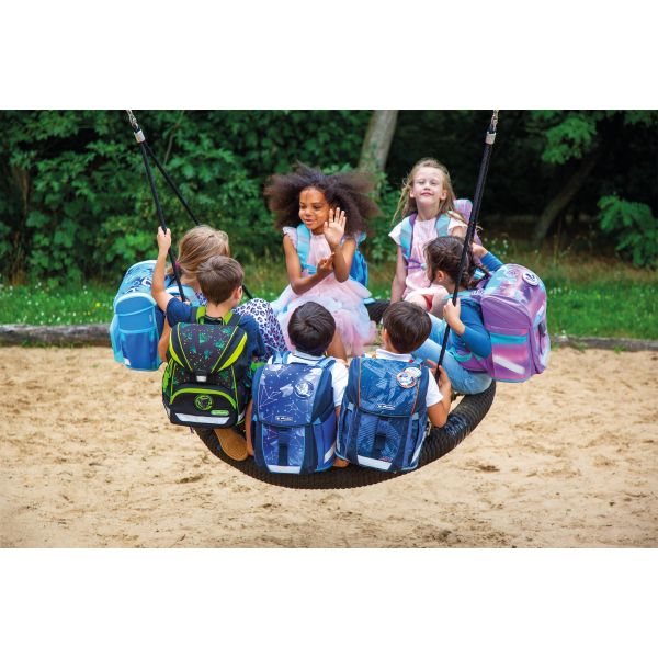 USP | Eigengewicht unter 800g; ergonomisch geformte Rückenpolster; verstellbare Schultergurte; höhenverstellbarer Brustgurt; angenehme Passform; Orafol Reflexmaterialien; Klickschloss mit Reflektor; geräumiges Innenfach mit separatem Bücherfach; 1 Fronttasche; 2 Seitentaschen; stabile Bodenplatte; unbefülltes Schüleretui mit 2 Klappen; Faulenzer oval; Sportbeutel; Maße: 39 x 32 x 25 cm; Gewicht: ca. 800g; Volumen: ca. 22l; Material: Polyester; Applikation: 1 abnehmbares Patchies, 1 Pompom |