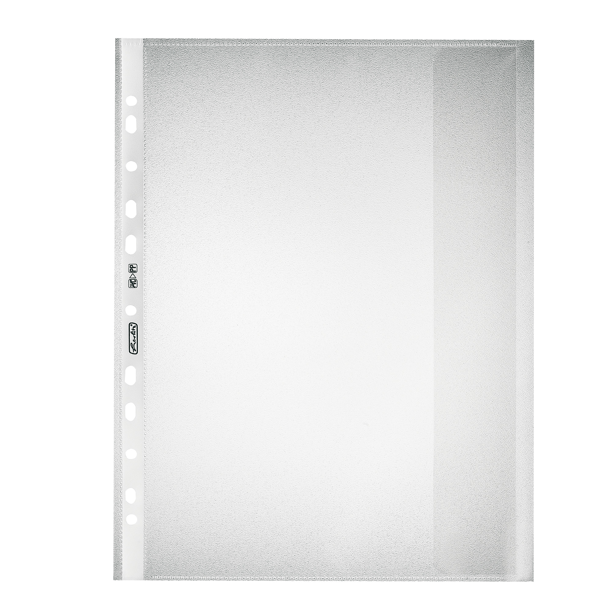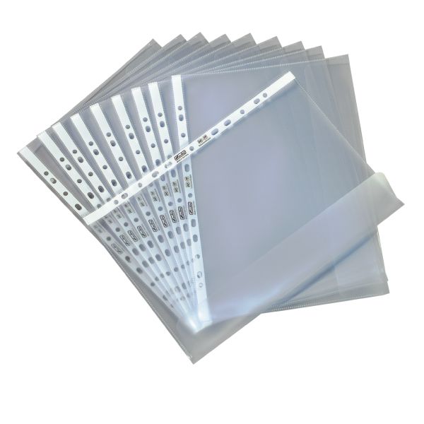 PP-foil smudge proof, embossed open on side to close with a flap reinforced spine, europunched transparent 10 pieces, shrink wrapped |
