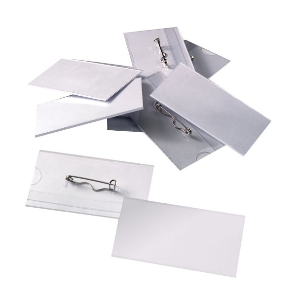 plastic 75 x 40 mm pin-on name badges with plain white inserts cardboard FSC mix transparent 10 pieces in box |