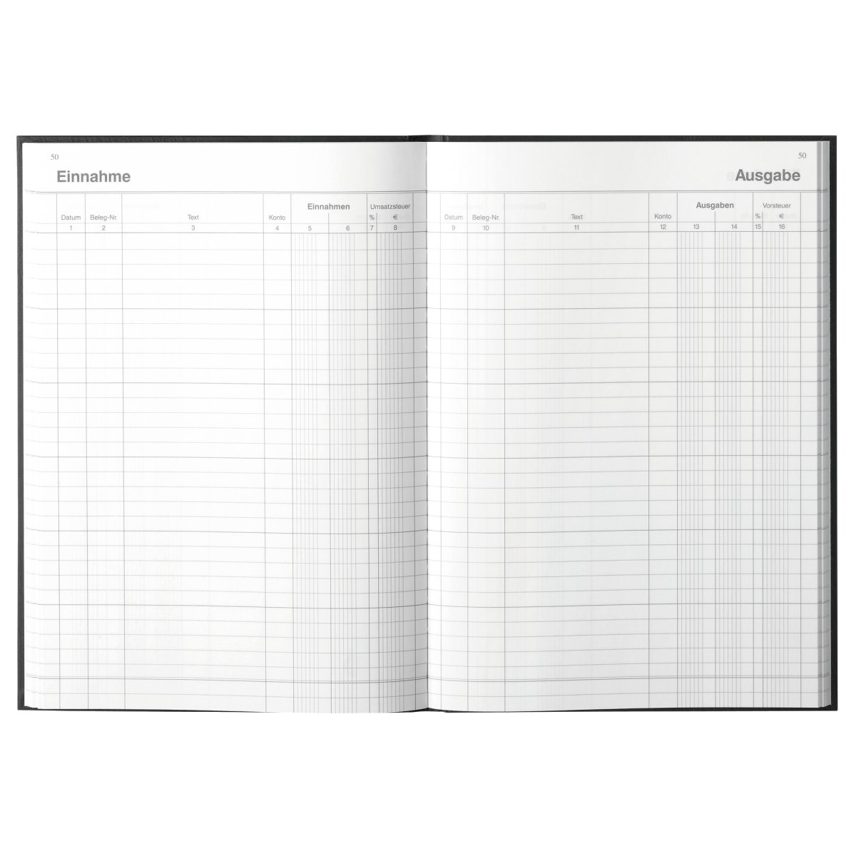 | laminated cardboard cover w. label 96 sheets, paper 80gsm thread stitching printed double-sided, 16 columns receipts/expenses, consec. numbered green 1 piece |