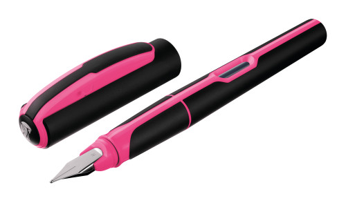 Description: | Füllhalter Style P57 M Neon Pink, dynamisch angeordnet, geöffnet/Kappe daneben, Art. Nr. 807340 |